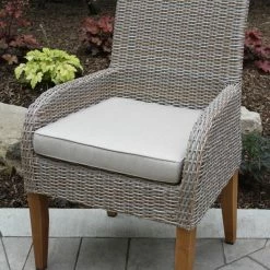 - Color: Natural teak, ash grey wicker, champagne linen cushion, and a grey/blue tabletop