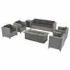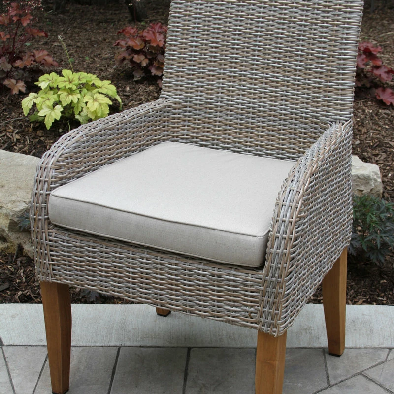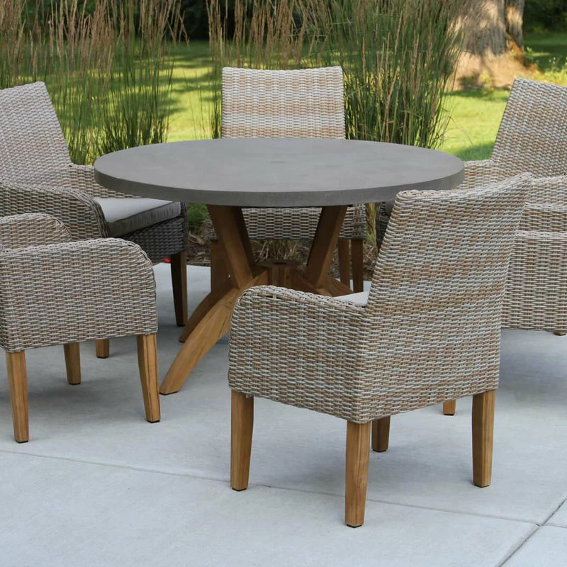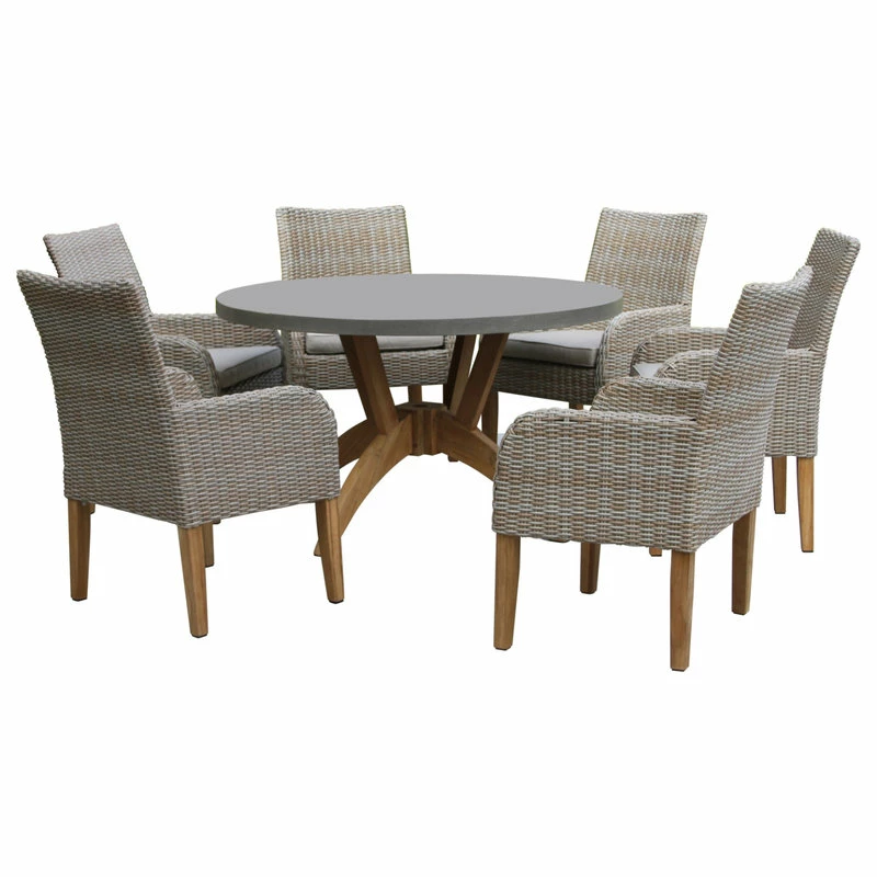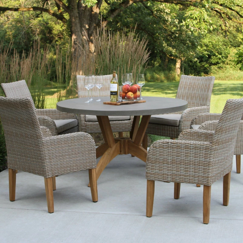 The 7 pc. Teak, Ash Grey Wicker & Composite Dining Set includes a poly concrete composite round tabletop with a beautiful solid teak nautical base and 6 ash grey-toned all-weather wicker and teak dining chairs with Sunbrella cushions.