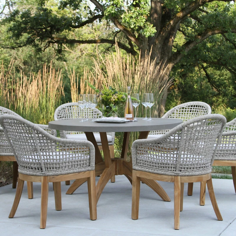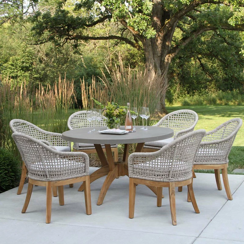 The 7 pc. Teak, Composite & Rope Round Dining Set brings a nautical, coastal vibe to any outdoor setting! This set begins with the highest quality FSC teak. The composite tabletop is made from a molded poly resin and blended with powdered concrete for texture and density. The chairs are premium double spun UV stabilized polyester fiber with inner nylon cord reinforcement for strength and lasting durability.