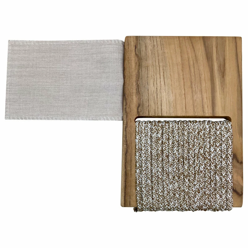 - Color: Natural teak, beige and tan weave rope, canvas flax cushions, and a grey/blue tabletop