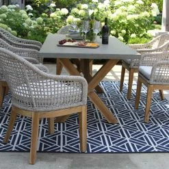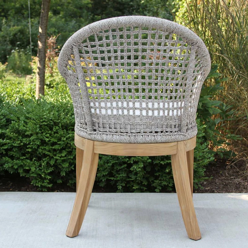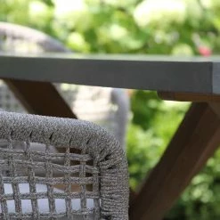 - Color: Natural teak, beige and tan weave rope, canvas flax cushions, and a grey/blue tabletop