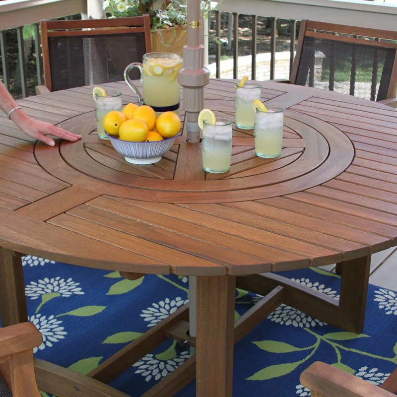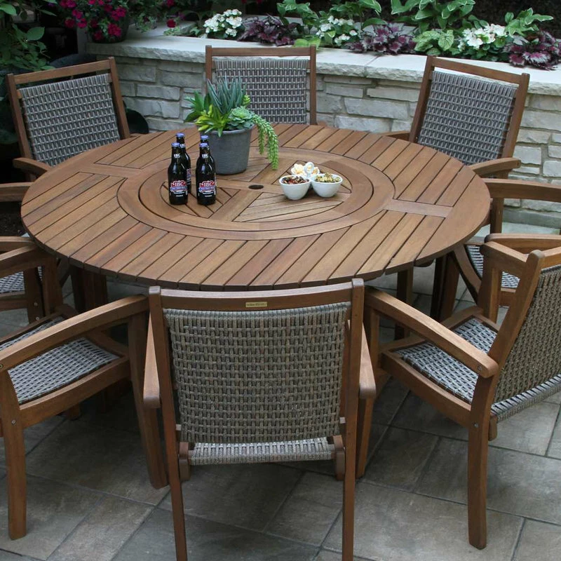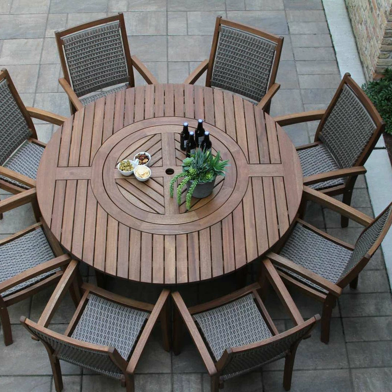 Looking to create an outdoor space, but don’t know where to begin? This 9-piece dining set is a great option for putting together an ensemble all at once. Crafted from eucalyptus, a natural decay, weather, and insect resistant wood, this 9-piece set includes 8 chairs and a table perfect for creating a patio dining area. Wicker seats in the chairs allow you to lean back for a long dinner chat.