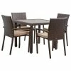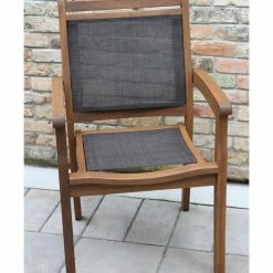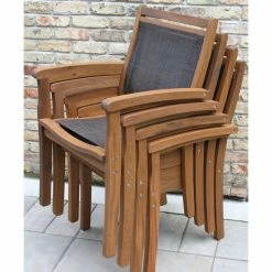 Enjoy your next meal alfresco with the Catania Dining Set. This stylish entertaining ensemble is crafted from eucalyptus with a rich brown stain and features black sling seats and seat backs. Its clean lines and simplicity add refinement to any patio setting.