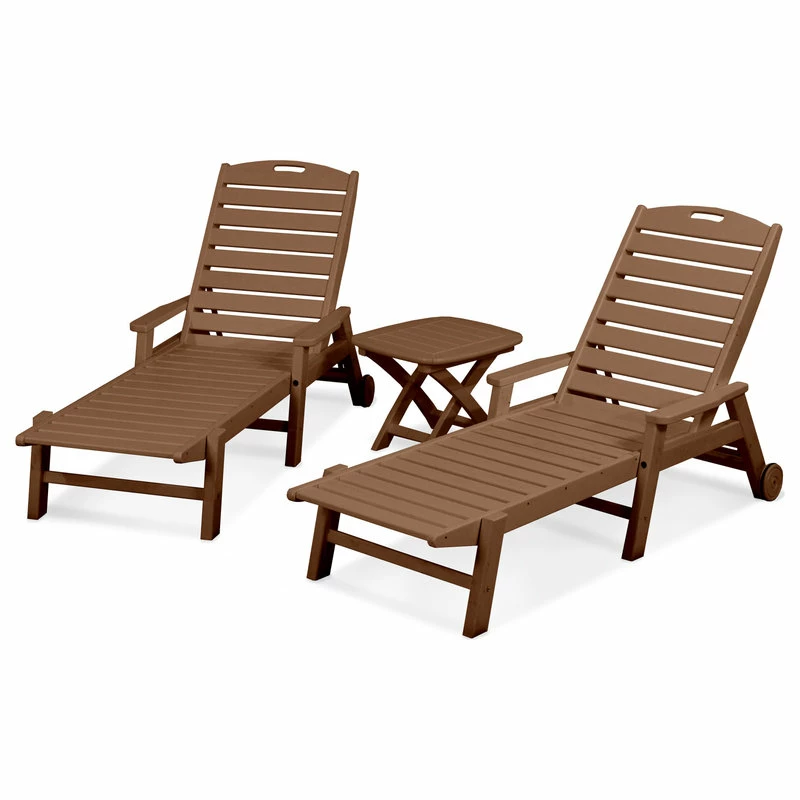 You’ll feel like you’re lounging on the deck of a luxurious cruise ship when you experience the POLYWOOD Nautical 3-Piece Chaise Set. Designed for ultimate relaxation, this set includes two Nautical Wheeled Chaises with Arms and a Nautical Side Table. The chaises feature five adjustable positions and are easy to stack and store when flat. The companion table is just the right size for drinks, snacks and a good book. This durable set is constructed of solid POLYWOOD recycled lumber, which gives it the look of painted wood without the maintenance wood requires