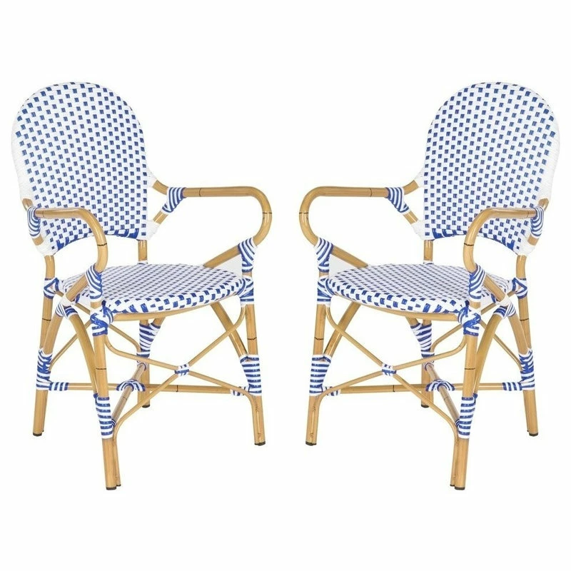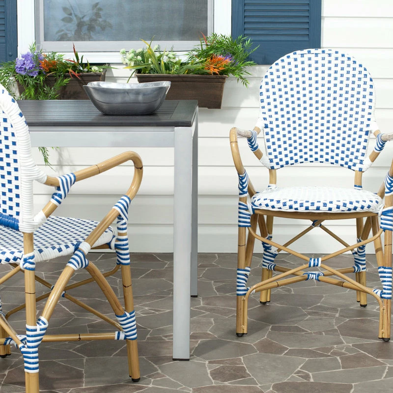 The beloved European bistro chair assumes a coastal cottage vibe in the blue and white Hooper indoor-outdoor stacking armchair by Safavieh. The cheerful woven PE wicker seat and back extends to pretty wrap detailing on the faux bamboo frame of this classically styled chair. Care Instructions: Store outdoor furniture indoors or cover well when not in use. Remove wooden furniture from standing water. Dust regularly with small brush or vacuum. Spills should be taken care of immediately before they harden or stain with a slightly dampened sponge. This chair is sold in a set of 2.