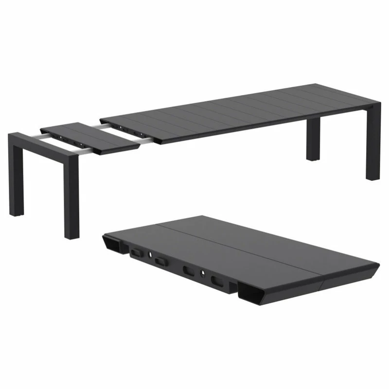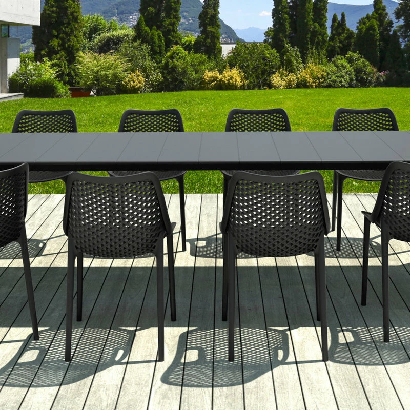 The Air 11 piece Dining Set comes with 10 chairs and one extension table that extends from 102 inches to 118 inches. Chairs made from 100% recyclable resin polypropylene with gas injection molded legs. For indoor and outdoor use. Table practically extendable for accommodating more guests. UV resistant. Easy to clean. Maintenance Free. Chairs are stackable.