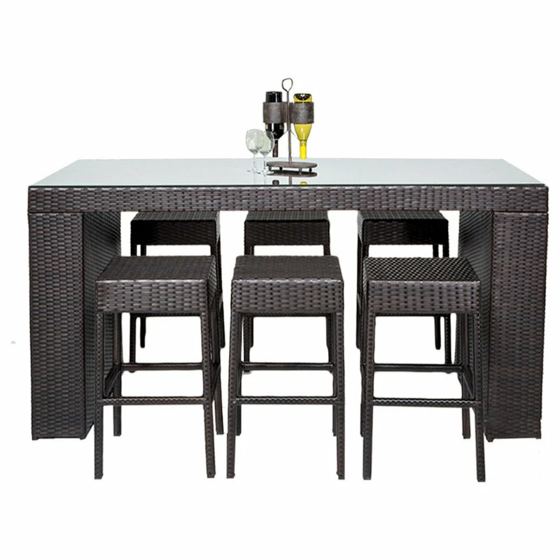 Simple, affordable and beautiful, our Bar Set is designed for ultra-comfortable outdoor dining. Table is topped with tempered glass and bar stools store neatly under the table.